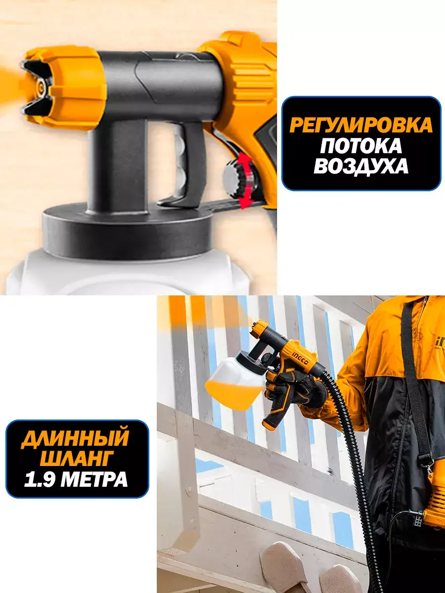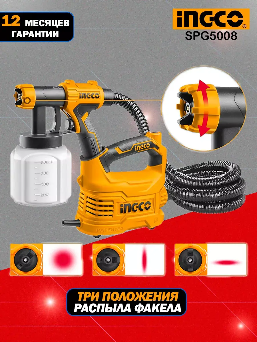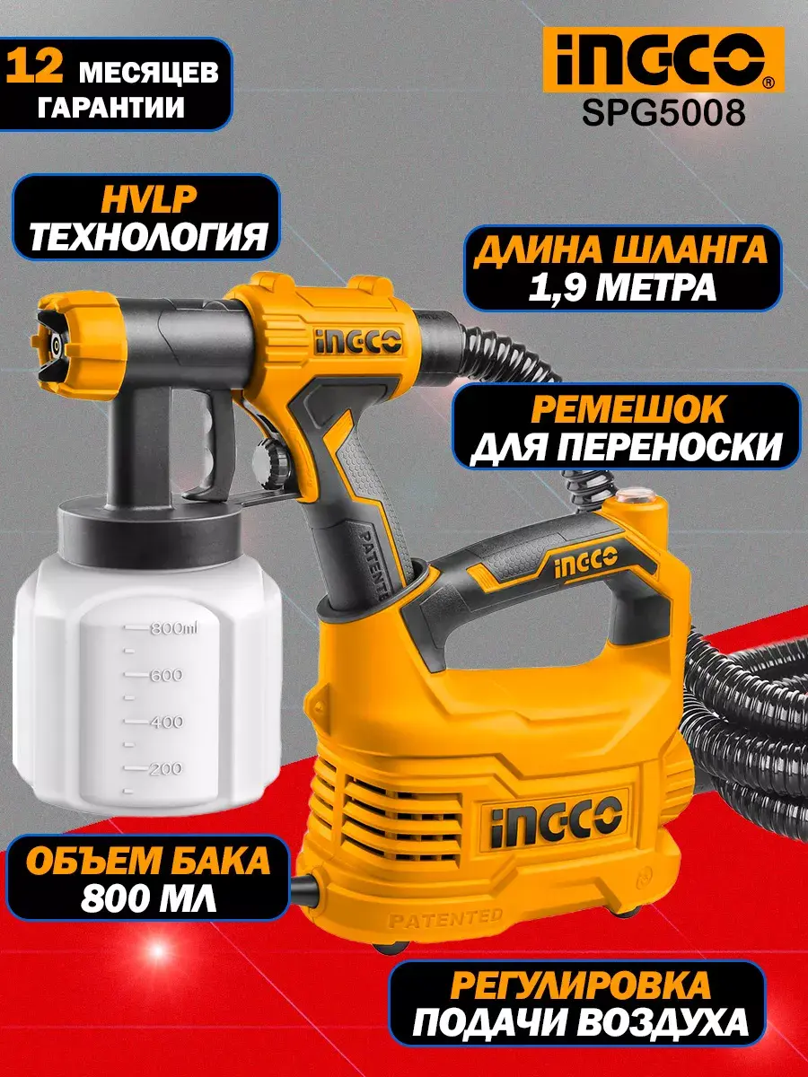 Электрический краскопульт INGCO SPG5008 INDUSTRIAL применяется для быстрого и равномерного нанесения красящих составов на различные поверхности.